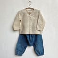 1 x pants: 100% organic cotton. Handblock printed using naturally hypoallergenic indigo colour. Elasticated waistband and bottom hem for easy pull and stay.