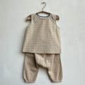 2 x jhabla tops: 100% organic cotton sleeveless top with envelope neck for hassle-free wearing. Hand block printed animals in a sea of blue and a printed polka design created by traditional Ajrakh artisans in naturally hypoallergenic indigo colour. 1 x pants: 100% organic cotton. Matching handblock printed polka pants with elasticated waistband and bottom hem. Part of our Zoo Treat poem collection. Sizes 2 years and above have side pockets and adjustable waist strings. Conscious of minimising waste, the set is packed in a reusable muslin bag with an interactive paper game tag, ready for gifting.